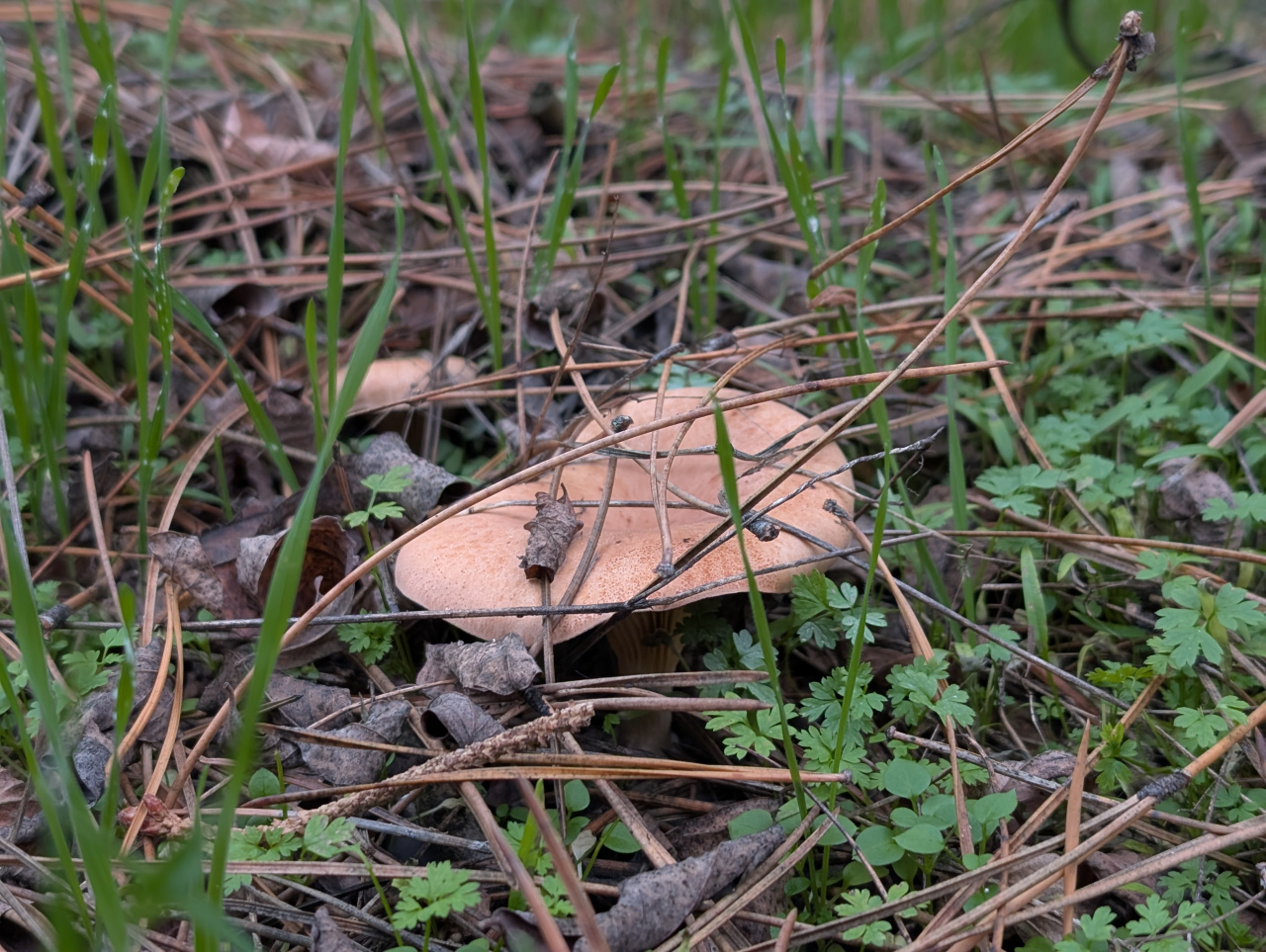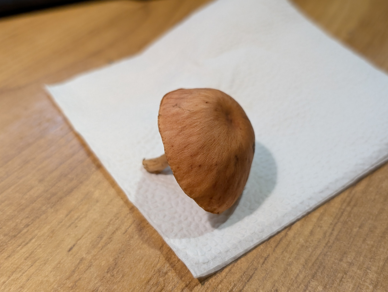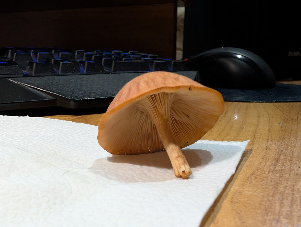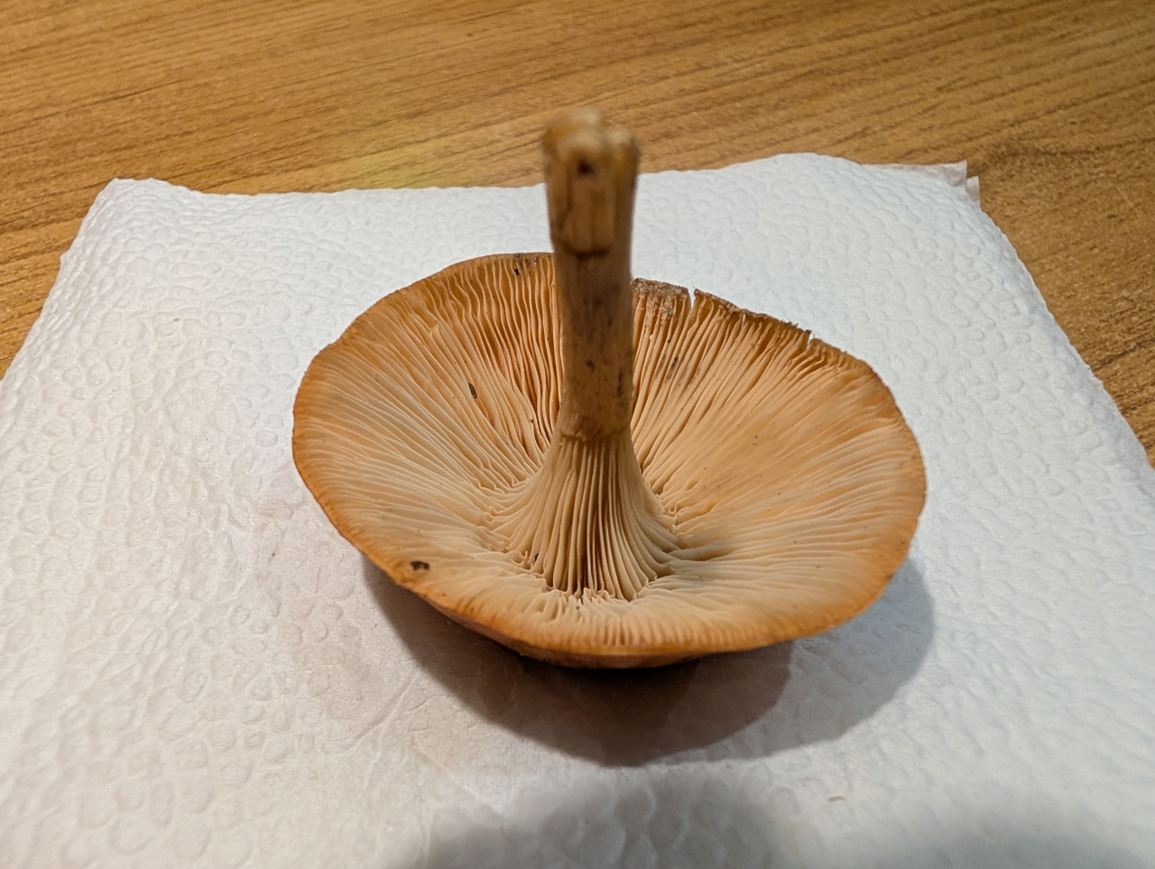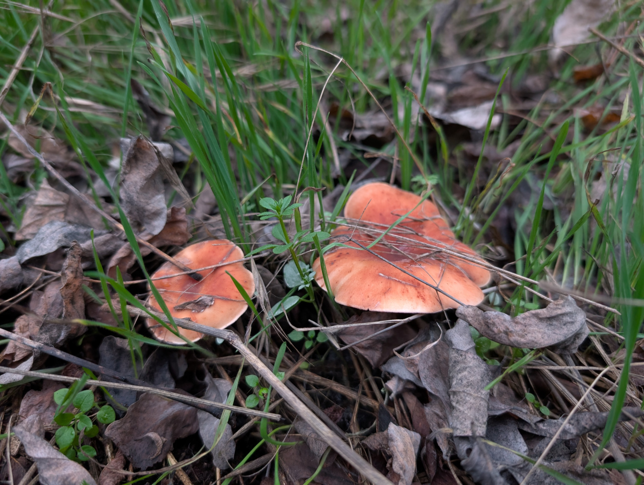 Описание гриба: Ноябрь, ростовская область, посадка акация/сосна. Температура уже месяц около +10. Пахнут приятно грибами, с небольшими фруктовыми нотами, растут полукольцами, будто бы на почве, но если раскопать — то на остатках деревьев, коре, листьях. Уже лет 10 собираю, ем, но так и никто не сказал, что это за гриб. Окраска темнее, если акации больше, светлее, если в хвое. Цвет не меняет на срезе. Иногда шляпка выворачивается как обычный зонтик, иногда плоская, иногда как у лисички вывернута.