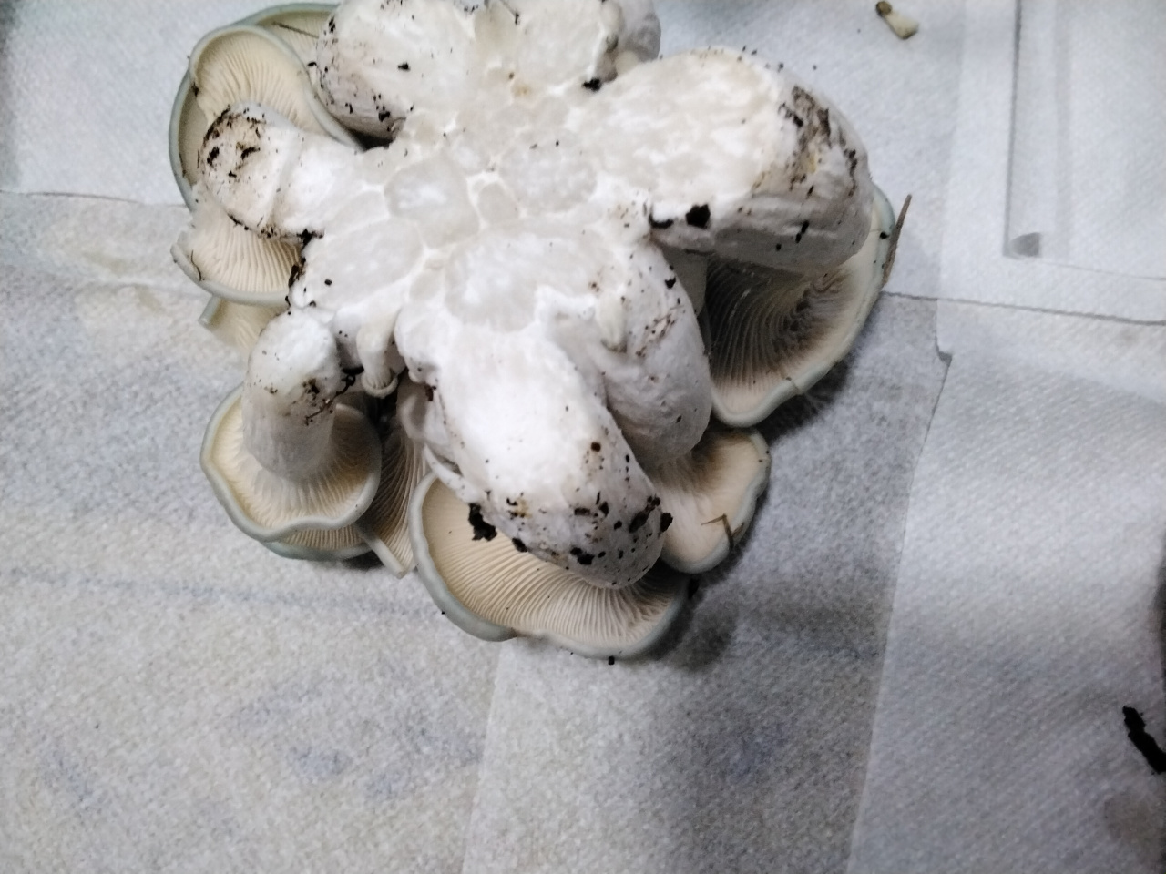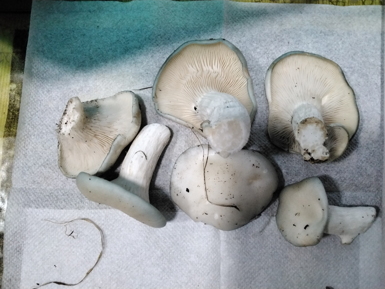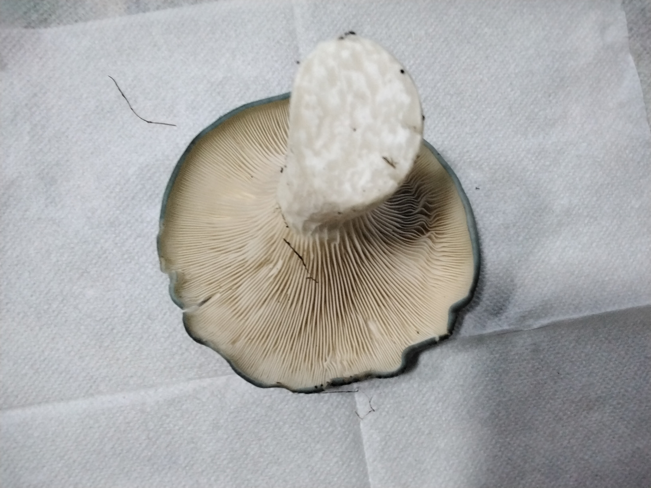 Описание гриба: Найден в лесопосадке.Росли кольцом вокруг ствола старого вяза. Часть коры отвалилась внизу или её отодрали. Растут группой, ножки срастаются. Шляпки белые, в центре немножко темные. Пластинки белые. После срезания края шляпки стали голубыми. Запах приятный грибной.