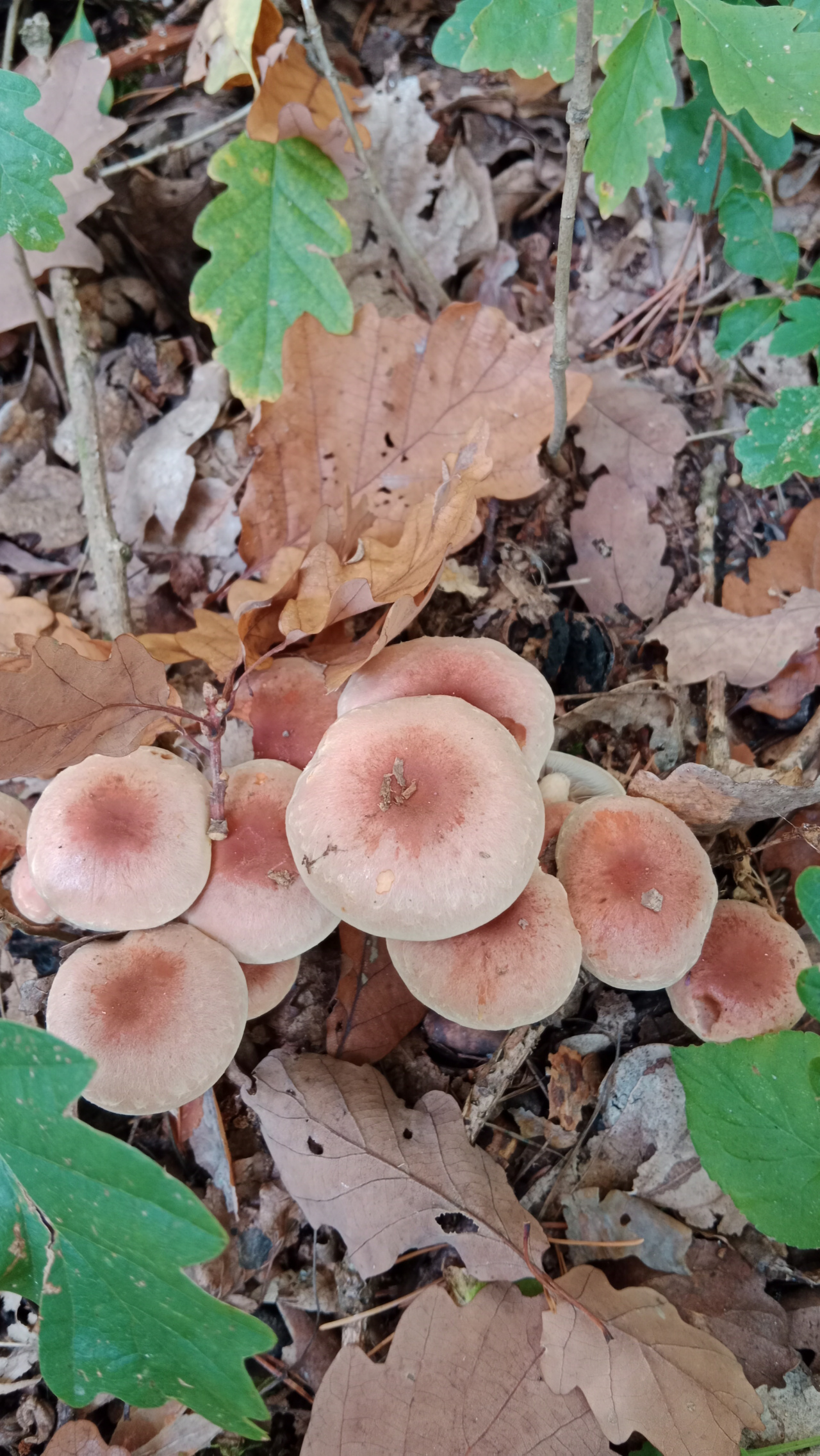 Описание гриба: Гриб пластинчатый. Прастинки частые , пепельносерые, шляпка небольшая,кирписнокрасная рос сростками на пеньке. Найдено в середине октября в смешанном лесу. На повреждениях цвет не меняет.