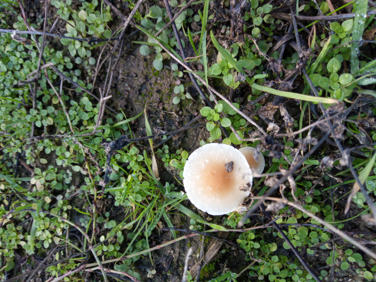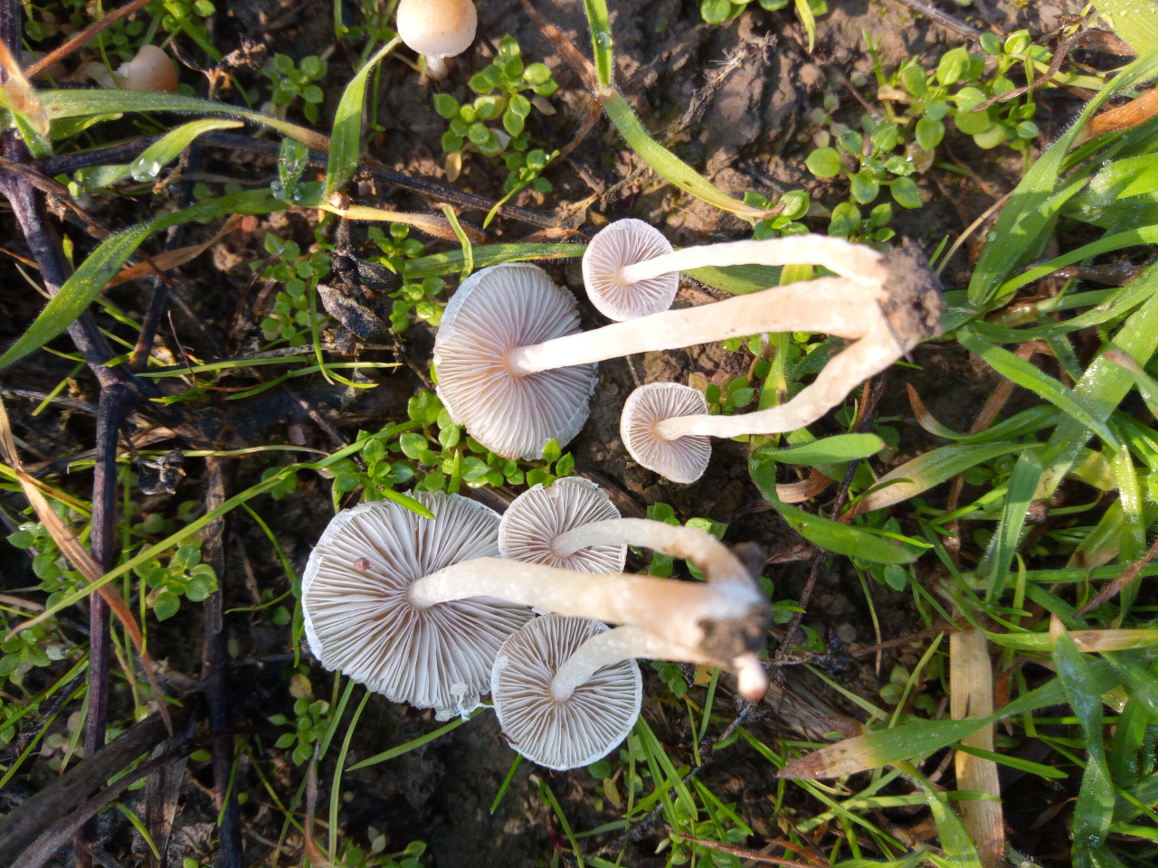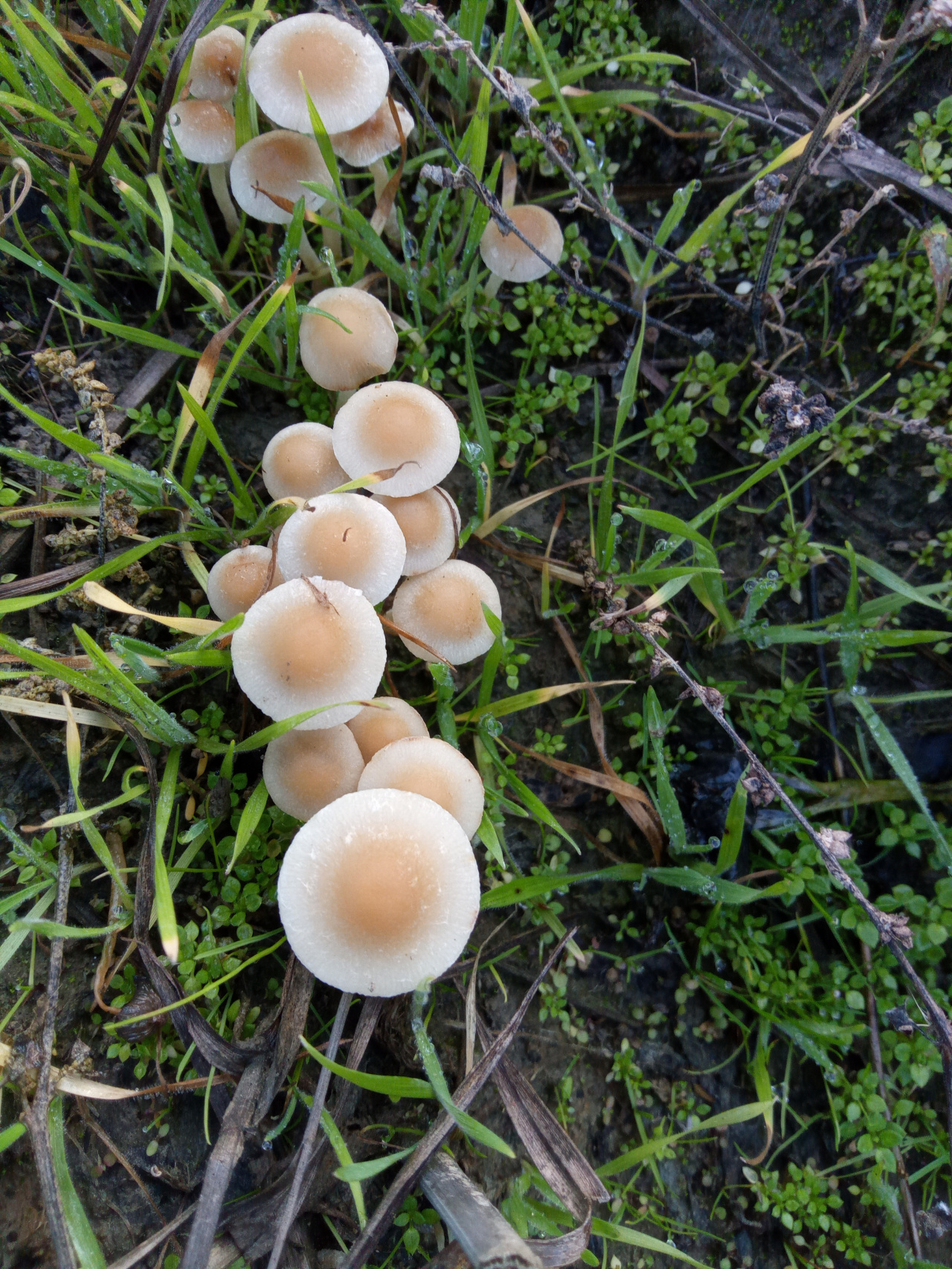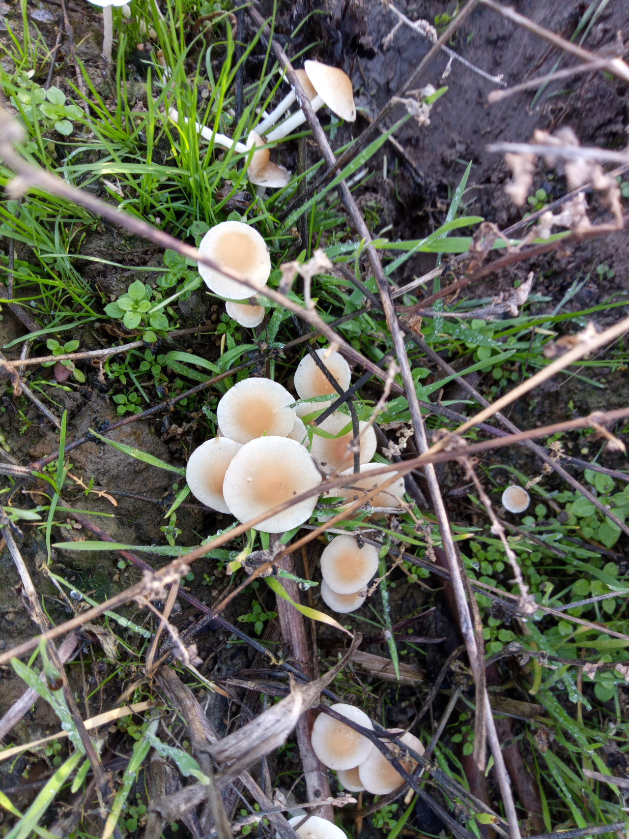 Описание гриба: Грибы мелкие росли в заброшенном,заросшем травой рыболовном ставке.Найдены 12.12.2024г. Подсказали что это весенний опёнок(колибия дуболюбивая,лесолюбивая),но есть сомнения.Будте добры подскажите что ето.