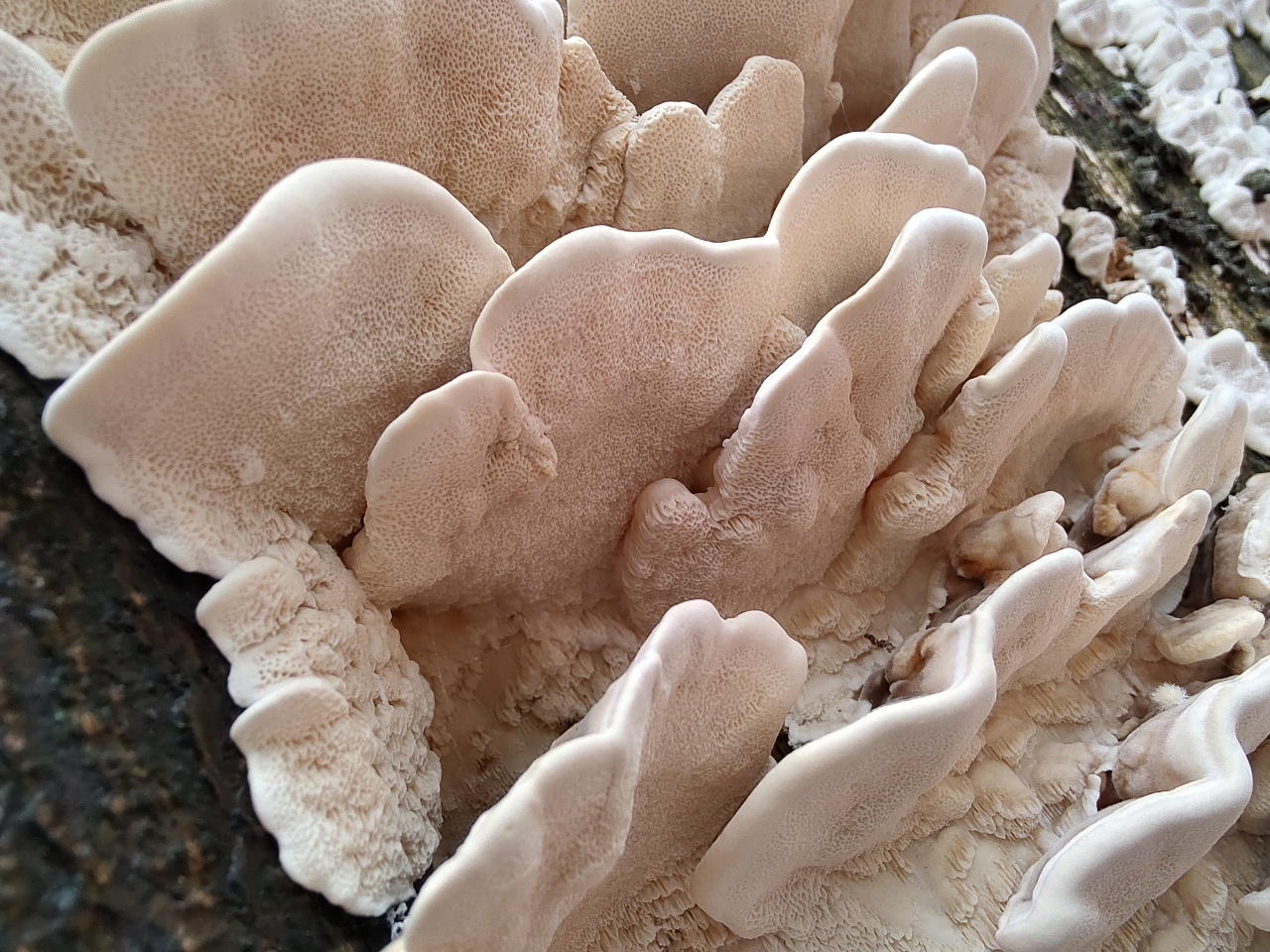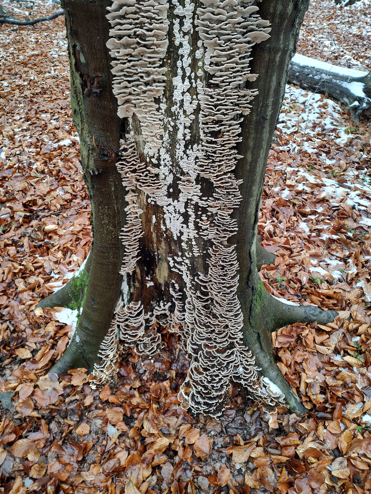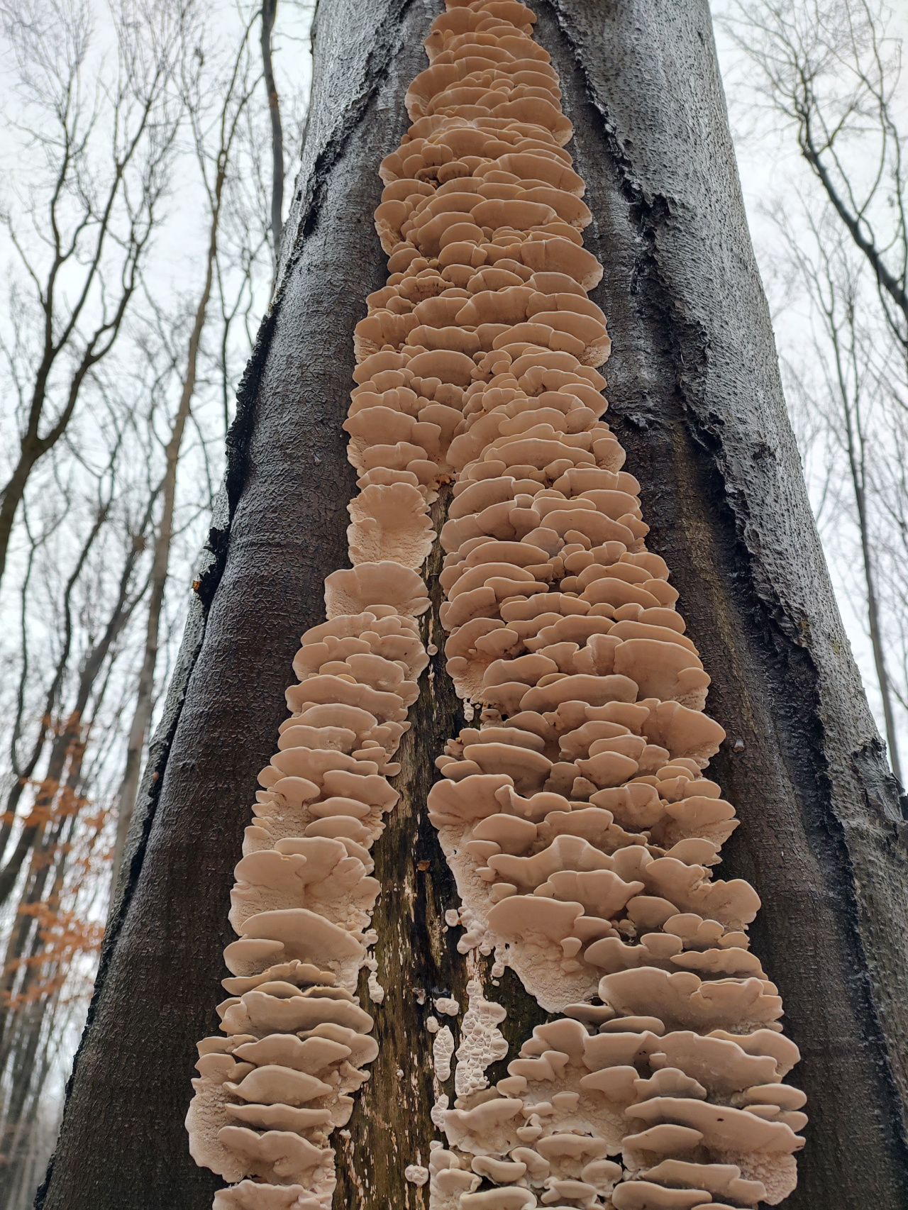 Описание гриба: Гриб растёт на стволе лиственного дерева большими сростками начиная с основания дерева и на несколько метров вверх по стволу. Грибы слегка мягковатые. 24.12.2025