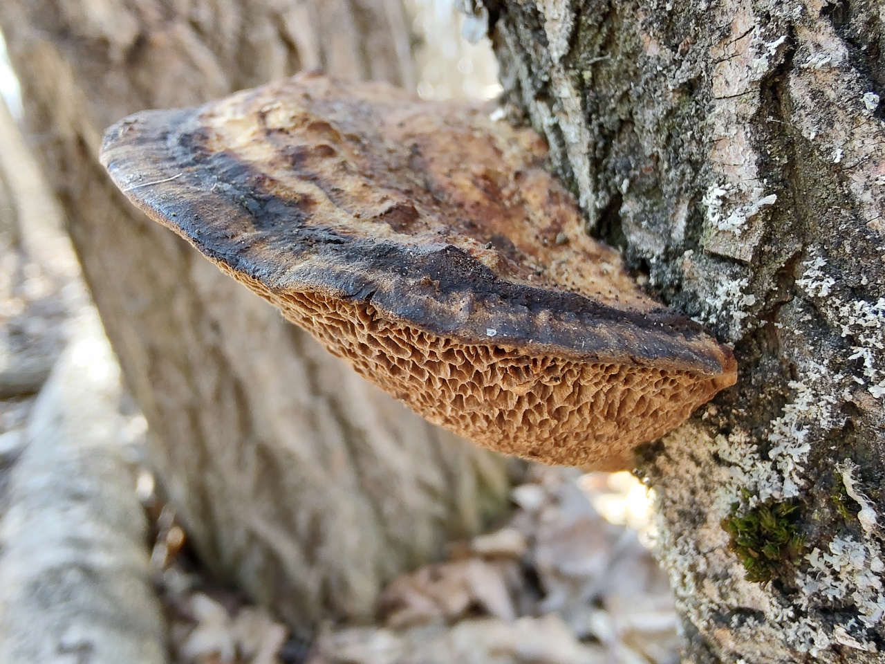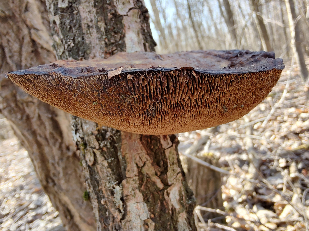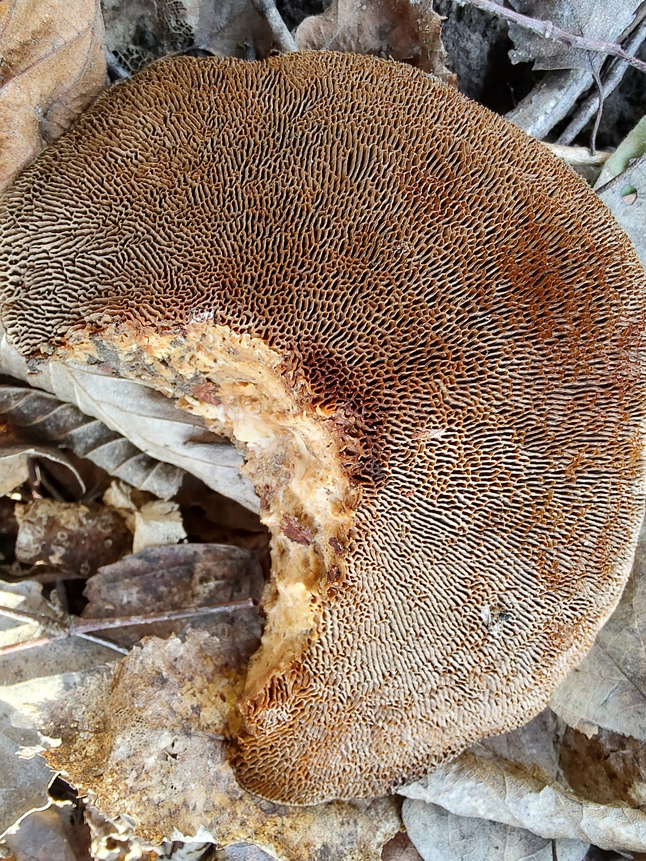 Описание гриба: Гриб растёт на мёртвом лиственном дереве и на крупных палках, лежащих на земле. Гриб мягкий, упругий, но ножом режется с трудом, как резиновый. Гименофор не пластинчатый и не трубчатый, а похож на какие-то лабиринты. Растёт в лиственном лесу, рядом липа, ольха, граб, дуб, орешник. 16.03.2026