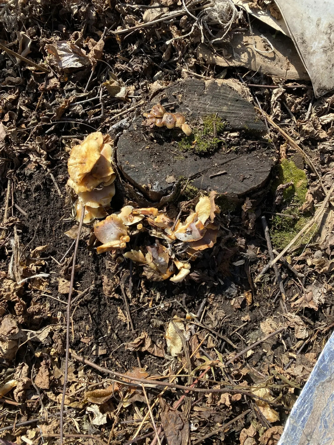 Описание гриба: Нашли на даче в опилках на пне под укрывным матерьял ом. Мокрые от дождя шляпки цвет светло жёлтый. Приморский край апрель.